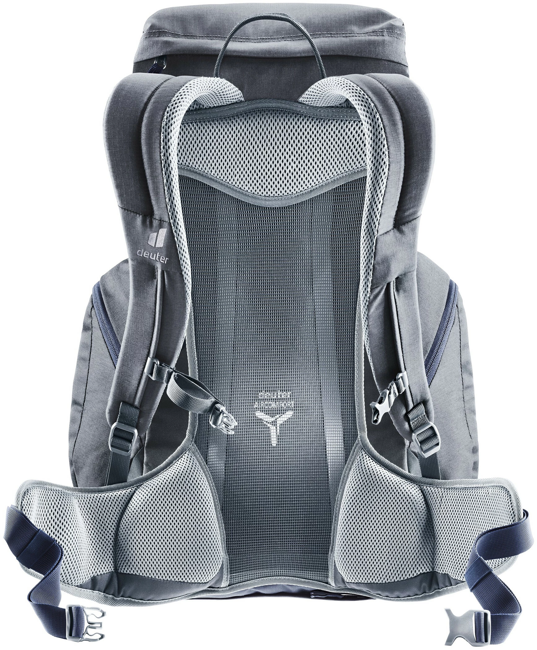 Met behulp van het gespannen Aircomfort speciaal gaas wordt een ventilatieruimte gecreëerd tussen de rugzak en de rug, waardoor de vochtige lucht ongehinderd kan ontsnappen. De gepatenteerde Deuter 3-zijdige ventilatie vermindert vochtverlies tot 25% (getest en bewezen door het gerenommeerde Hohenstein Instituut).