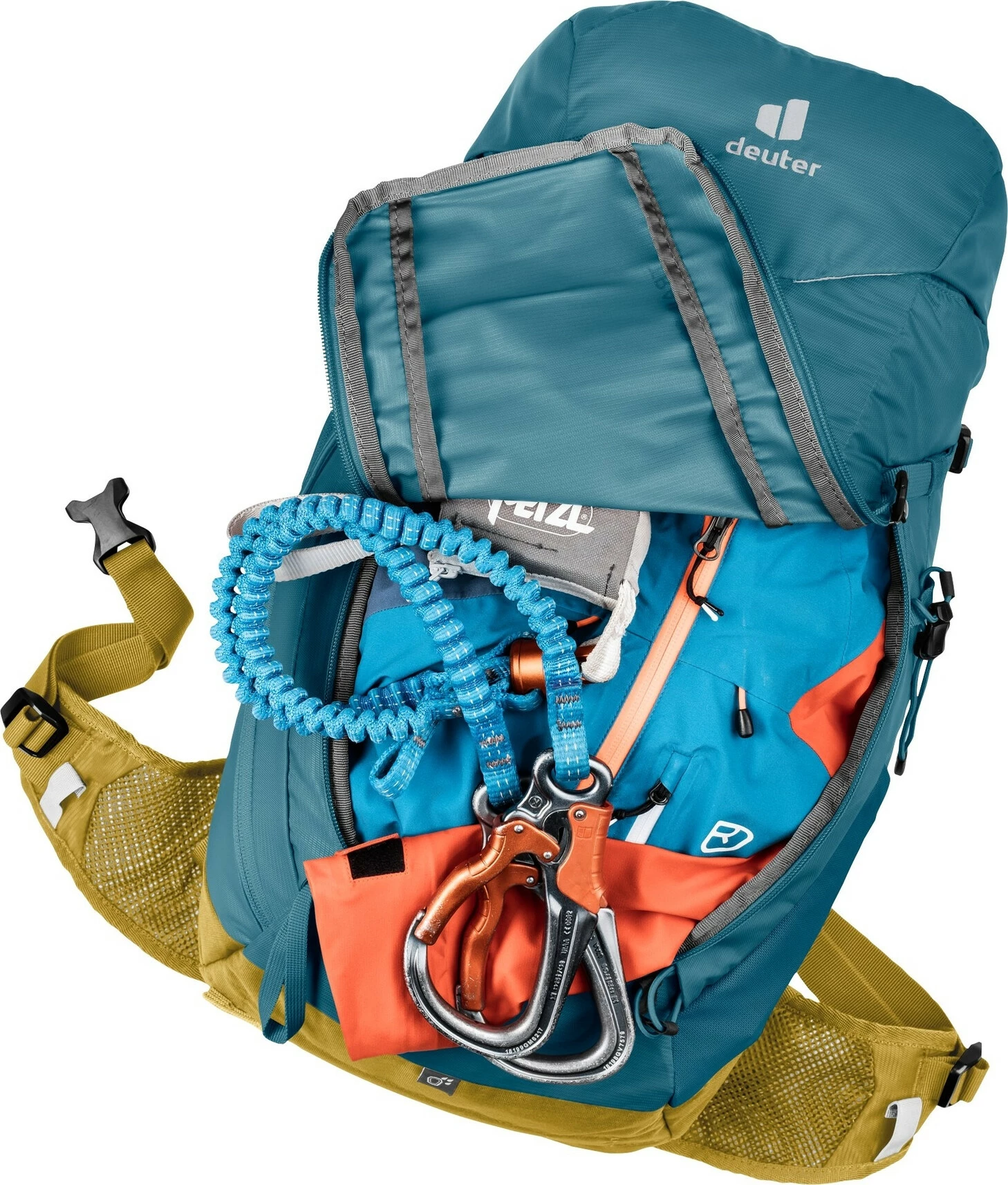 - Karabijnhaakbevestigingen voor de klettersteigenset op de schouderbanden