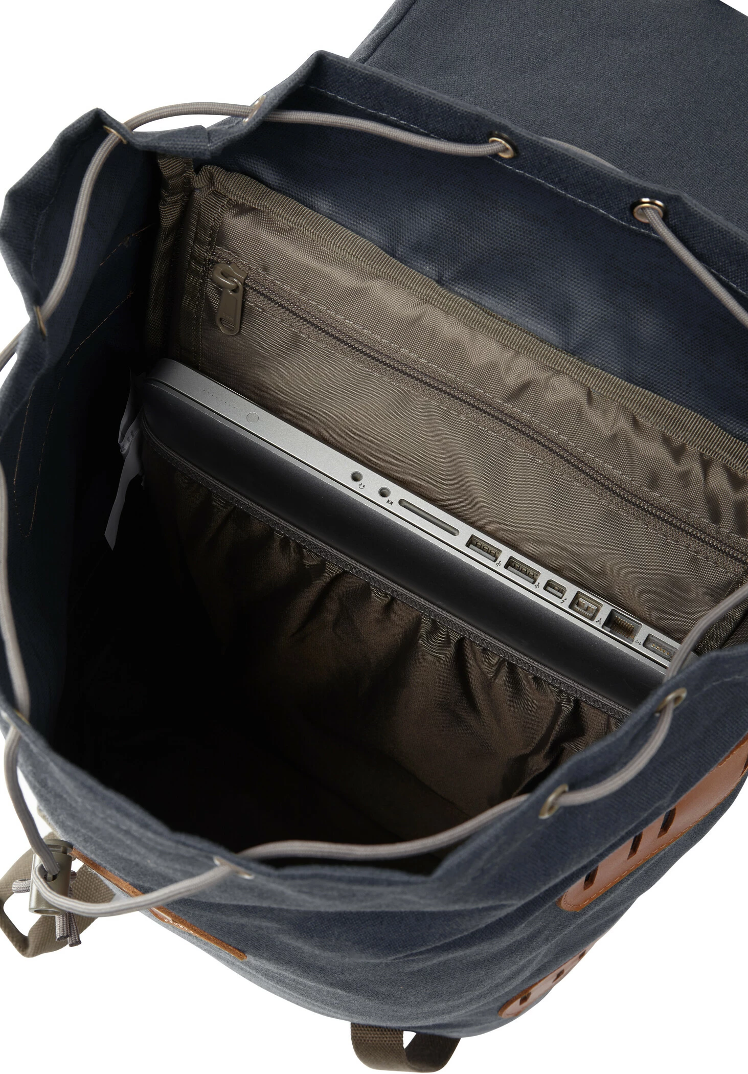 Het is voorzien van een toplaadontwerp met trekkoord, grote gespen, duurzame canvasstof en lederen bekleding. Binnenin is er een binnenzak voor waardevolle spullen en een zak voor een laptop of een hydratatiepakket.