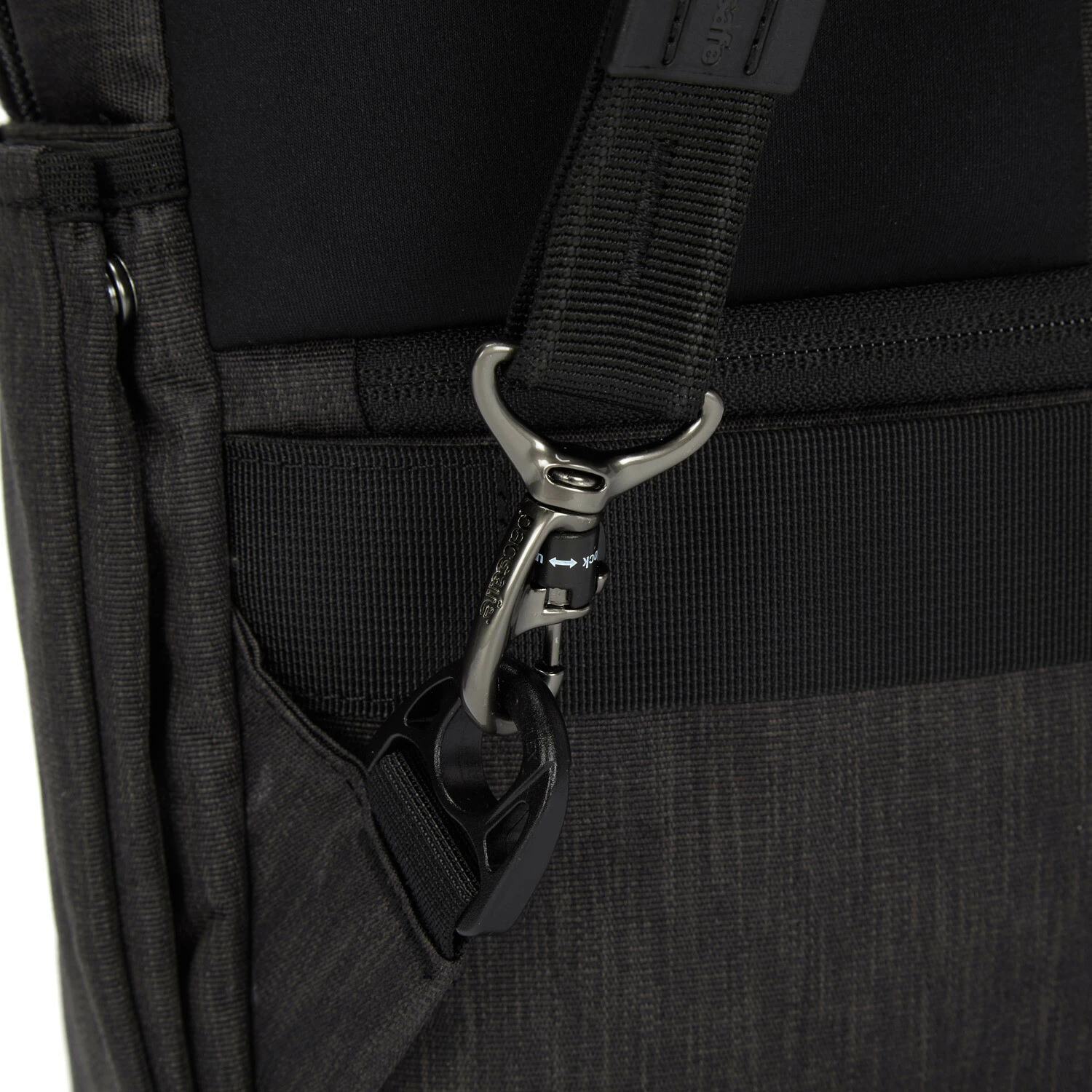 Om de tas aan een vast voorwerp te bevestigen, kan de haak worden geopend. Het speciale draaimechanisme van de haak sluit deze af om eenvoudige diefstal te voorkomen.