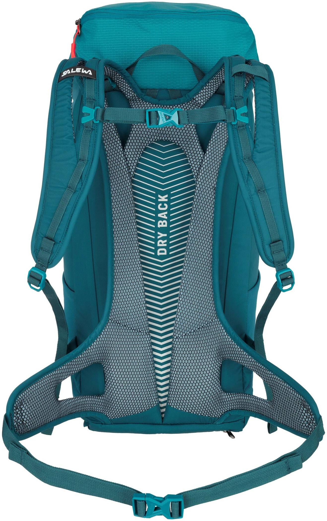 Vrouwelijke wandelrugzak met opbergbare regenhoes in een top-loader ontwerp met U-vormige ritssluiting aan de voorkant toegang tot het hoofdgedeelte van de rugzak.